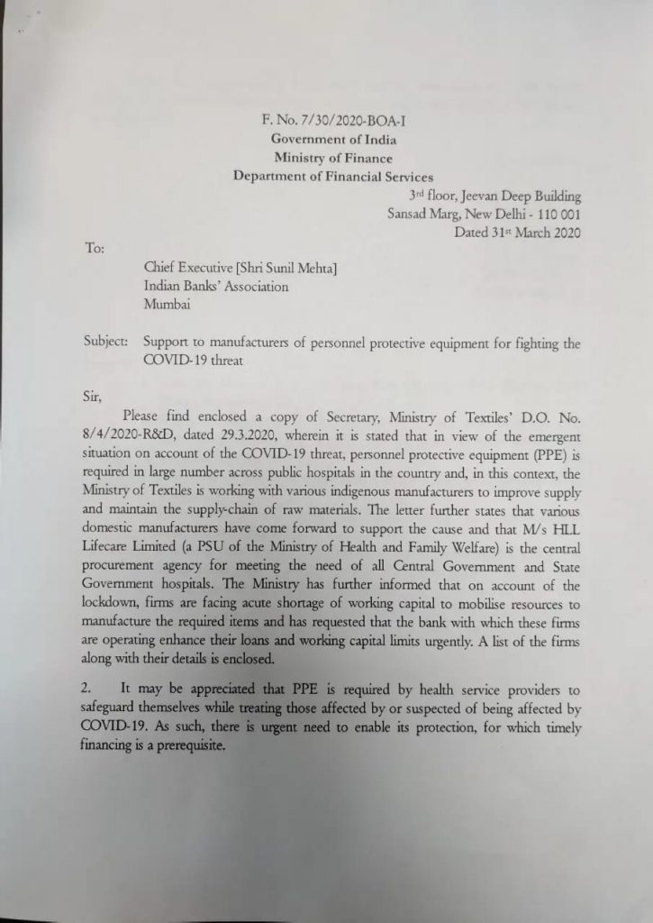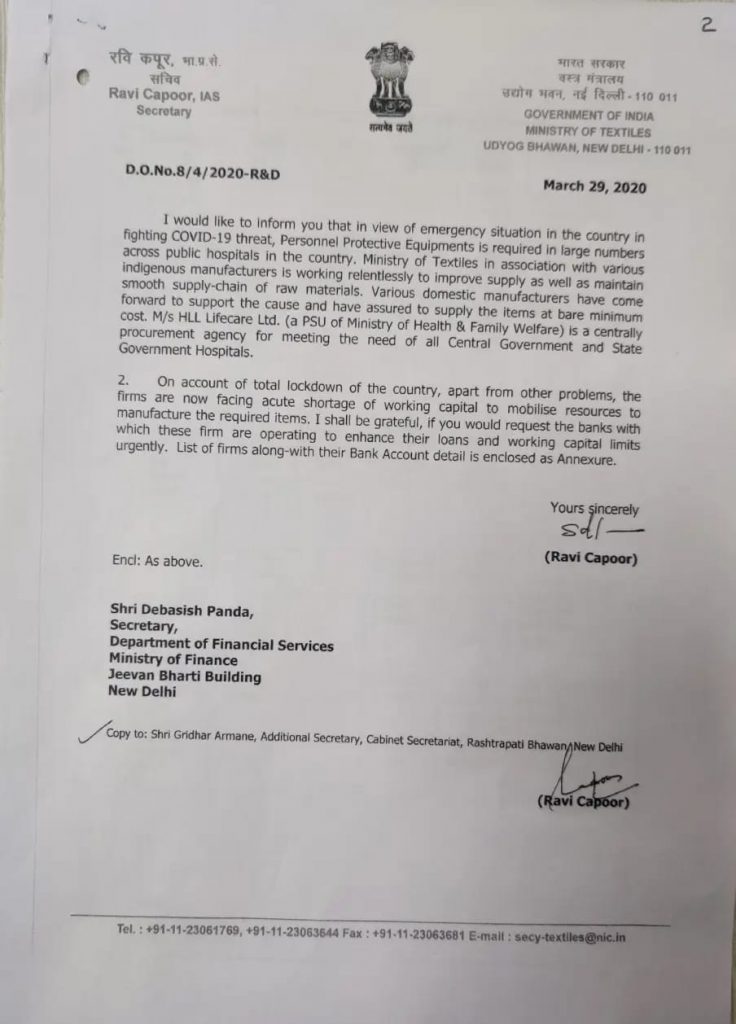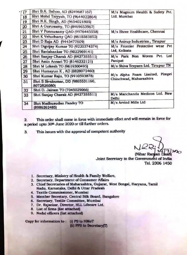 ২৩ মার্চ দেশের স্বাস্থ্য মন্ত্রক এক বিবৃতিতে জানায় February থেকে তারা সেফটি গিয়ার নির্মাতাদের সাথে যোগাযোগ রেখে চলেছে, পরেরদিন সমান পরিমান সেফটি গিয়ার চেয়ে দেশের স্বাস্থ্যমন্ত্রক এর পক্ষ থেকে বিশ্বব্যাপী টেন্ডার আপলোড করা হয়। ৩০ মার্চ এক বিবৃতি দিয়ে বলা হয় ১১ টি ভারতীয় সংস্থার সাথে , ২১ লক্ষ কভার অলের জন্য চুক্তি করা হয়েছে, পরে আরো একটি সংস্থার সাথে ৫ লক্ষ কভার অলের জন্য চুক্তি হয়েছে বলে জানানো হয়। ওই বিবৃতিতে আরো বলা হয়, দক্ষিণ কোরিয়া ও সিঙ্গাপুর থেকেও ৩০ লক্ষ কভার অল আমদানি করতে হবে।