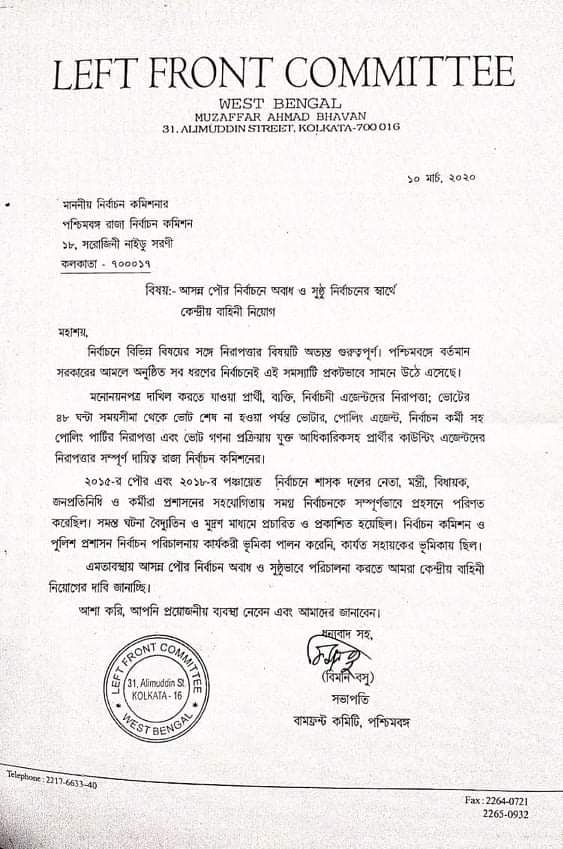তৃণমূল কংগ্রেস রাজ্যের সরকার পরিচালনার শুরু থেকে এ রাজ্যে নির্বাচন প্রক্রিয়াকে প্রহসনে পরিণত করা হয়েছে। বিশেষ করে ২০১৫-এ রাজ্যের পৌরসভাগুলোর নির্বাচন ও ২০১৮ এর পঞ্চায়েত নির্বাচনের পর্বে শাসক দলের পক্ষ থেকে বিরোধীদের ওপরে ও সাধারণ ভোটারদের ওপরে ভয়াবহ সন্ত্রাস নামিয়ে আনা হয়। সেই ঘটনার পুনরাবৃত্তি ঠেকাতে আজ রাজ্য বামফ্রন্টের পক্ষ থেকে রাজ্য নির্বাচন কমিশনারের সাথে সাক্ষৎ করে আসন্ন পৌর নির্বাচনে কেন্দ্রীয় বাহিনীর তত্ত্বাবধানে নির্বাচন প্রক্রিয়া সুষ্ঠুভাবে সম্পন্ন করার দাবি জানানো হয় ও স্মারকলিপি প্রদান করা হয়।