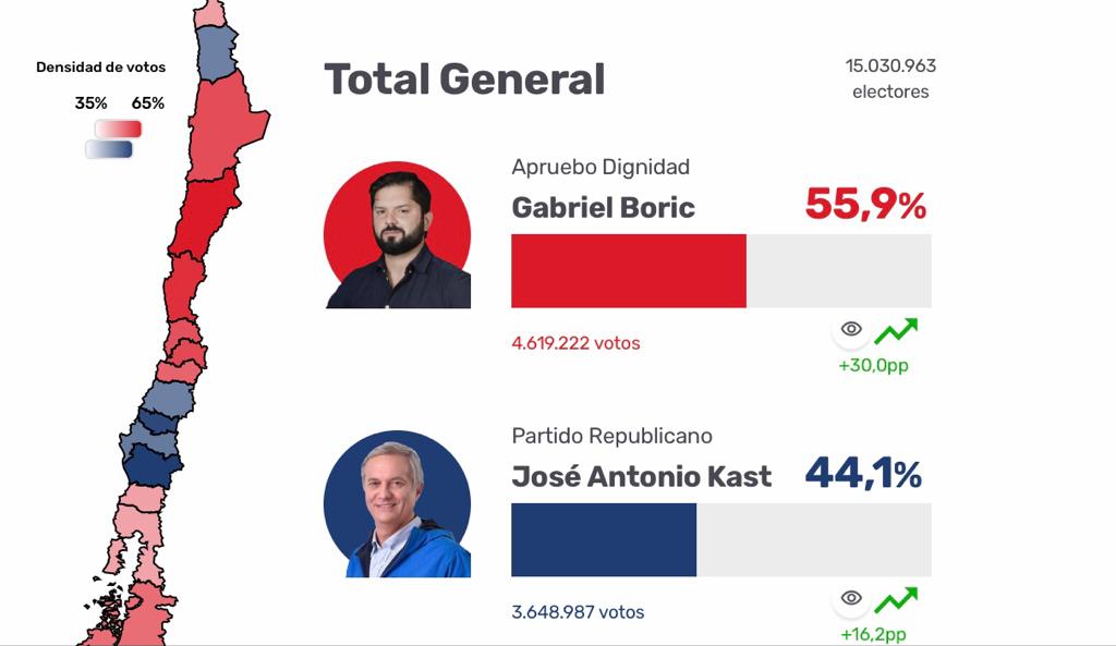 ১৯ নভেম্বর, প্রথমদফার ভোটে সবচেয়ে বেশি ভোট পেয়েছিলেন কাস্ত। সমর্থনের হার ছিল ২৭.৯ শতাংশ। বোরিক পেয়েছিলেন ২৫.৮ শতাংশ। রবিবার চূড়ান্ত পর্বের ভোটে বোরিক পেয়েছেন ৫৫.৮৭ শতাংশ ভোট। বিপরীতে কাস্ত ৪৪.১৩ শতাংশ। বছরপঁয়ত্রিশের বোরিক বলেছেন, ‘চিলি যদি নয়া উদারবাদের আঁতুড়ঘর হয়ে থাকে, এবার তা হবে নয়া উদারবাদের কবরস্থান।’