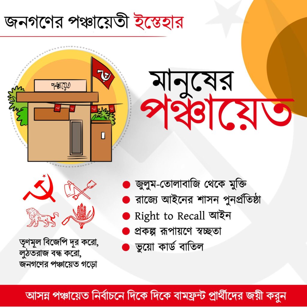 পুলিশ ভোট প্রচারে বাধা দিয়েছে। তাও লড়াইয়ের ময়দানে বামফ্রন্ট এবং সহযোগীরা আছেন। প্রতিদিন বোমা ফাটছে, মানুষ মারা যাচ্ছেন। মমতা ব্যানার্জির মতোই পুলিশের ডিজি বলেছেন, ‘কয়েকটা ছোট ঘটনা’। নির্বাচন কমিশনার আর ডিজি দু’জনেই কানে ব্লু টুথ লাগিয়ে বসে আছেন, কালীঘাট থেকে যা নির্দেশ আসছে তাই বলছেন। পুলিশ প্রশাসন কালীঘাটের বিবৃতি না দিয়ে বলুক, আর রক্তপাত হবে না, বোমা ফাটবে না। বেআইনি অস্ত্র উদ্ধার করুক। পুলিশ যদি ভূমিকা পালন না করে, রাজ্য নির্বাচন কমিশন যদি অবাধ নির্বাচনের ব্যবস্থা না করে তাহলে মানুষকেই সজাগ ও সতর্ক ভূমিকা পালন করতে হবে। সিভিল সোসাইটিকেও দায়িত্ব পালন করতে হবে। শাসকদলের অত্যাচারের বিরুদ্ধে লড়াই করে মনোনয়ন জমা দেওয়া প্রতিদ্বন্দ্বিতা সবকিছু মানুষ করেছেন, এখন ভোটের দিন ভোট লুটের চেষ্টা হলে, গণনার দিনেও লুটের চেষ্টা হলে তা রোখার জন্য যা করার করতে হবে। মানুষ রায়কে প্রতিফলিত করতে বদ্ধপরিকর।